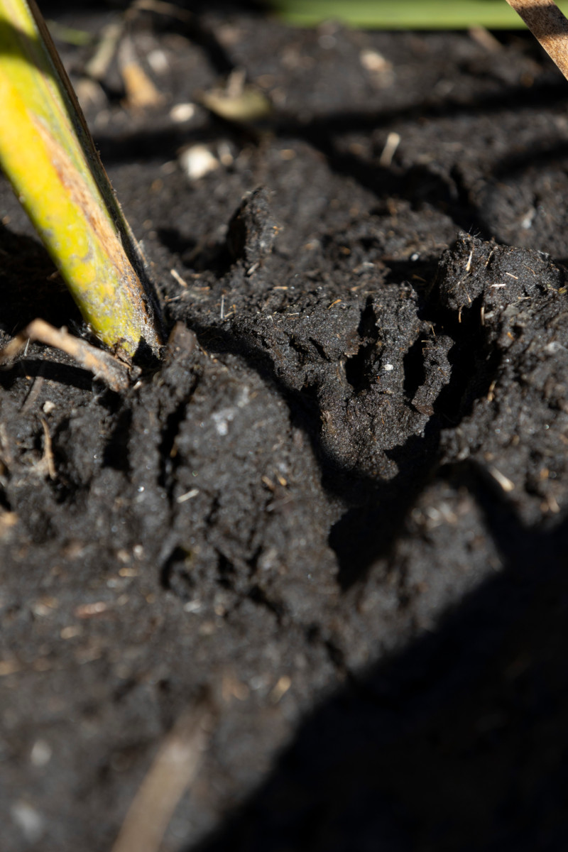 Beaver footprints indent the mud atop a dam on Katie McCullough’s property, Oct. 18, 2024, near Rio, Wis. (Joe Timmerman / Wisconsin Watch)