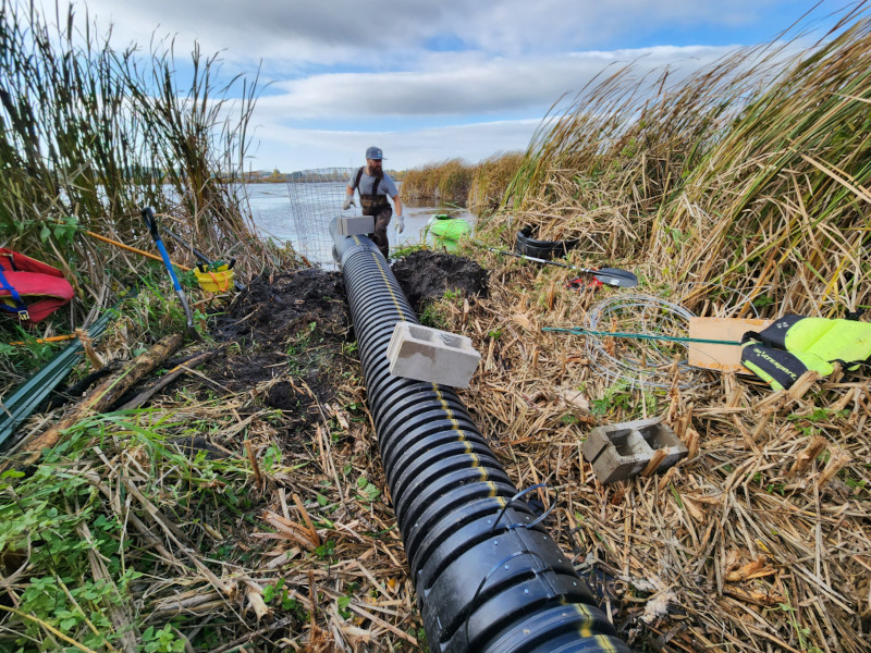 Dan Fuhs, co-owner of Native Range Ecological, installs a pond leveler in October 2023, near the village of Rio, Wis. (Courtesy of Clay Frazer)