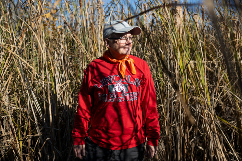 Katie McCullough is shown alongside the pond on her property on Oct. 18, 2024, near Rio, Wis. (Joe Timmerman / Wisconsin Watch)