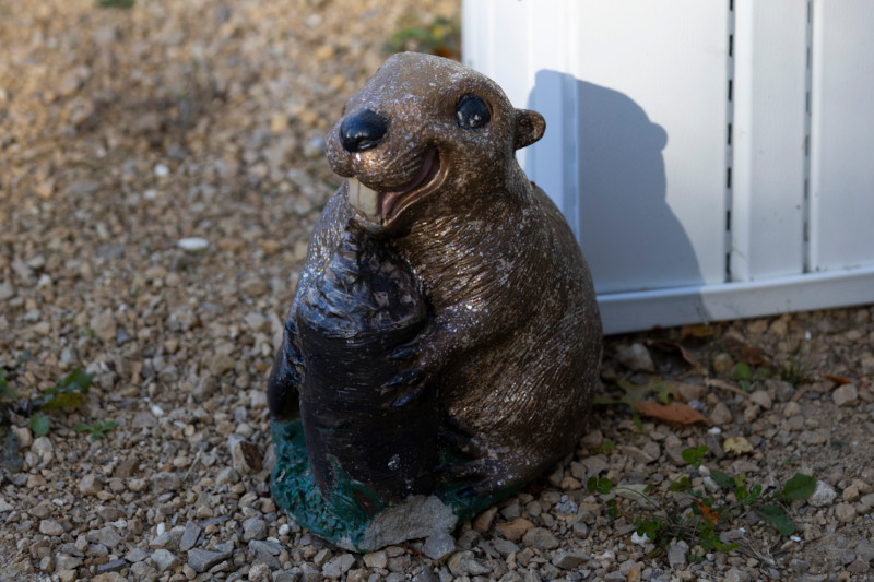 A smiling, buck-toothed beaver statue inconspicuously sits on the gravel driveway outside her home. Its concrete paws grasp a skinny tree stump, chewed to a sharp point.